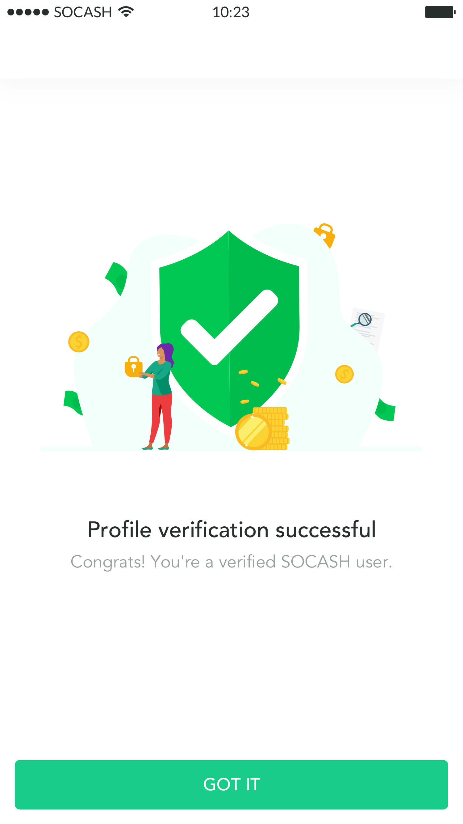 We will notify you of your successful profile verification on the SOCASH App with the following message on the app: